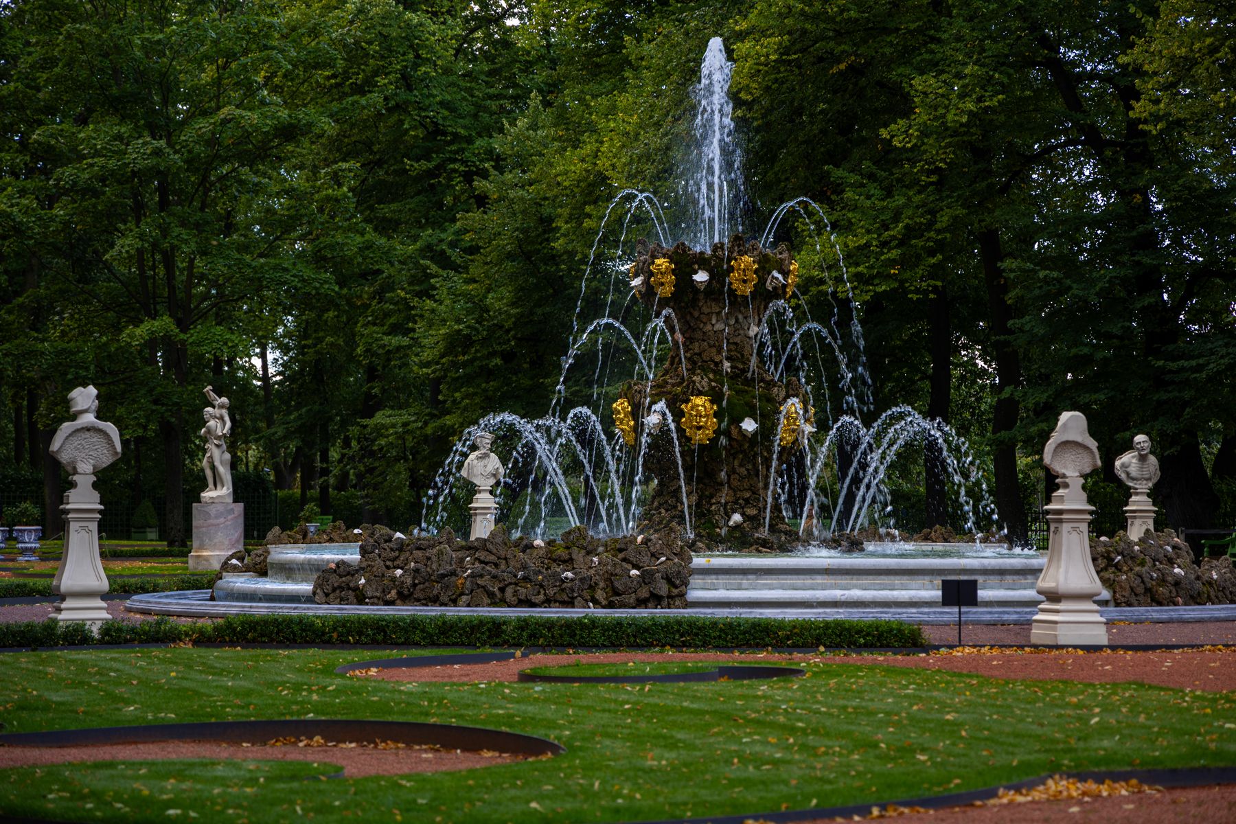 Фонтаны когда-то были уникальной особенностью, украшающей сад. Кроме классических величественных сюжетов были и шутливые. Все уничтожил потоп в конце 18 века. Однако в 2000-х годах начали процесс реставрации, в итоге восстановили восемь экземпляров. «Пирамида» имеет ступенчатые очертания, а струи «Коронного» создают корону.